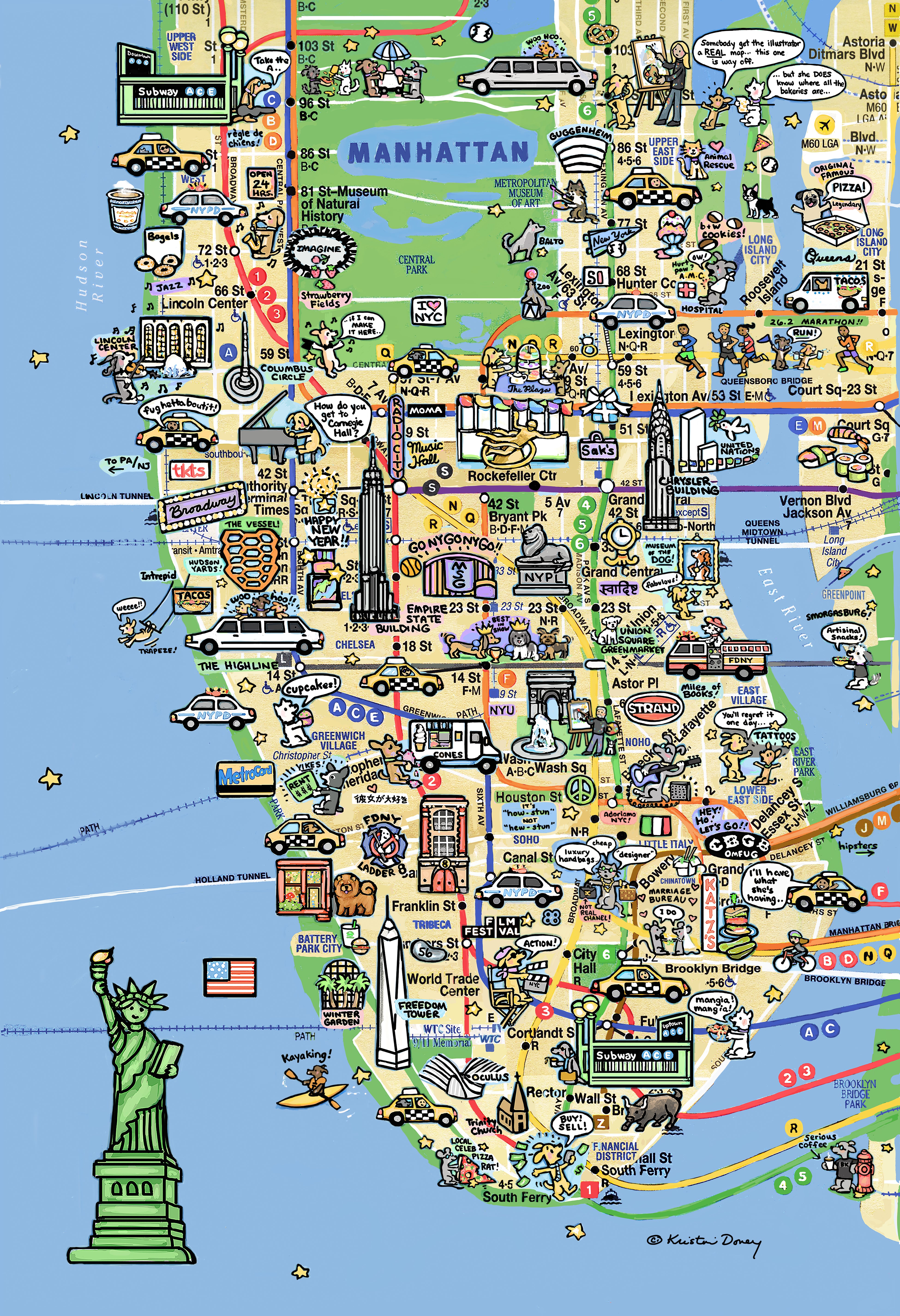 An illustration of dogs exploring New York City on a colorful map poster print. Available in 2 sizes 8.5 x... Leer más...