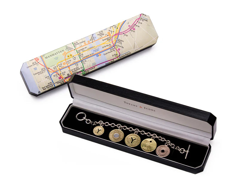 This bracelet sports authentic coins used for the New York City transit system from 1953-2003. Sterling Silver & 7.5 inches... Leer más...